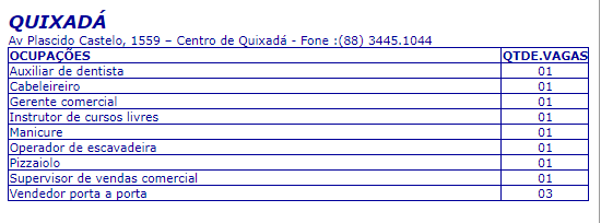 Para Quixadá existem vagas disponíveis para cabeleireiro, manicure, auxiliar de dentista, entre outros.
