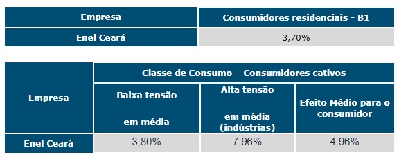 A agência aprovou o reajuste para consumidores residenciais – baixa tensão – de 3,70%. Para os consumidores empresariais o reajuste ficou da seguinte forma: baixa tensão em média de 3,80% e alta tensão – indústrias – aumento em média de 7,96%.