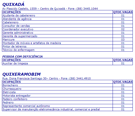 Confira abaixo somente as vagas para as cidades de Quixadá e Quixeramobim, divulgadas pelo Sine/IDT.