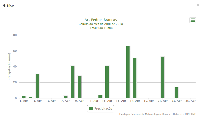 No Açude Pedras Brancas, reservatório que atualmente abastece os municípios de Quixadá e Quixeramobim e que está com 15,64% de seu volume total, somente neste mês de abril, já recebeu mais de 300 milímetros de chuva, para ser mais preciso foram 338.10mm, nos 25 primeiros dias do mês, quantidade que poderá ser ainda maior, uma vez que ainda faltam cinco dias para o mês chegar ao fim.