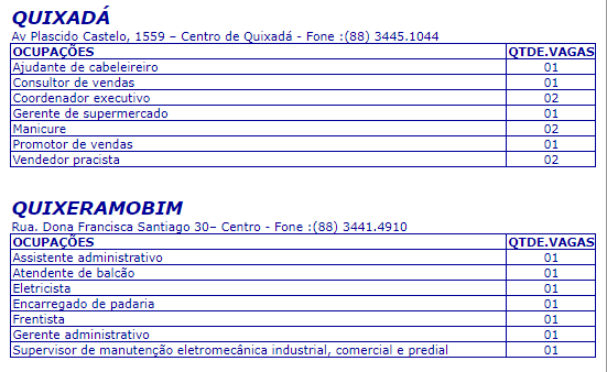 Para Quixadá e Quixeramobim as vagas disponíveis são para manicure, vendedor pracista, eletricista, frentista, entre outros.