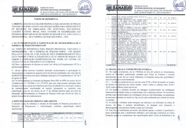 Ainda segundo o edital, os serviços serão destinados, por um ano, para sete secretarias da prefeitura na realização de pequenas reuniões de governo. As secretarias que pagarão pelas refeições são a de Educação; Saúde; Assistência Social; Agricultura; Infraestrutura; Cultura, Turismo, Indústria e Comércio; e a secretaria de Esporte, Juventude e Lazer. No banquete, custeado pelos contribuintes de Banabuiú, serão servidas quase 40 mil refeições entre lanches e quentinhas.