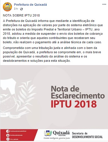 Acontece que, após conseguir a aprovação na Câmara de Vereadores de um projeto de lei que punia a população de Quixadá com um aumento de mais de 100% do IPTU, o alcaide voltou atrás e emitiu uma nota informando que adotou a medida de suspender o envio dos boletos de cobrança e orientando que aqueles que já receberam o boleto não realizem o pagamento.