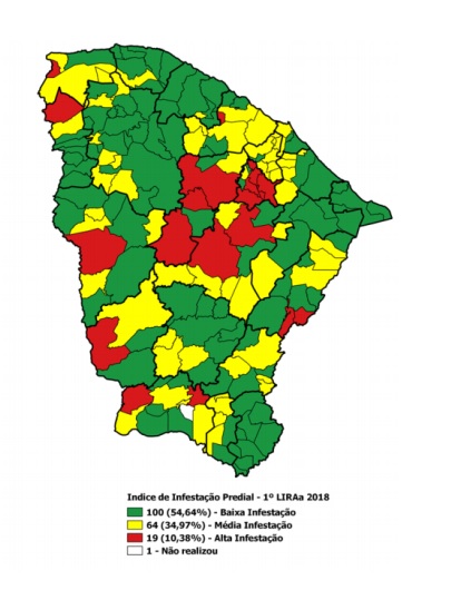 O novo Levantamento Rápido de Índices de Infestação pelo Aedes aegypti (LIRAa) de 2018 aponta que 83 cidades estão em situação de alerta ou risco de surto de dengue, zika e chikungunya no estado do Ceará. Desse total, 19 estão em risco de surto das doenças. Outros 64 aparecem em alerta e 101 estão em situação satisfatória. Fortaleza, a capital do estado, está situação de alerta.