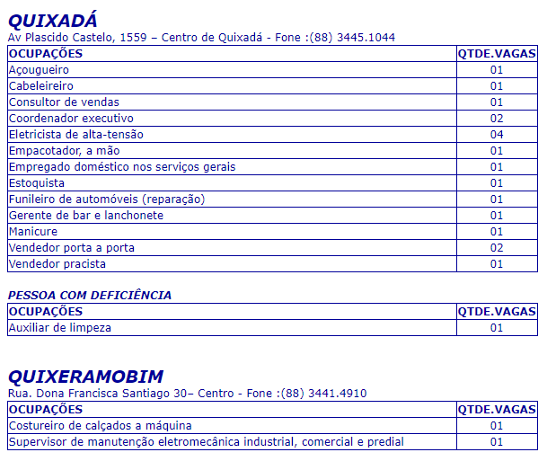 Para Quixadá e Quixeramobim as vagas disponíveis são para consultor de vendas, estoquista, manicure, costureiro de calçados a máquina, entre outros.