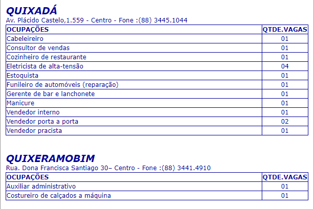 Para Quixadá e Quixeramobim as vagas disponíveis são para cabeleireiro, estoquista, auxiliar administrativo, entre outros.