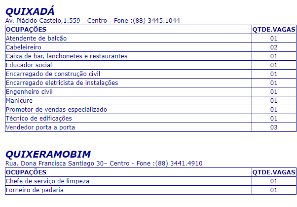 Confira abaixo somente as vagas para as cidades de Quixadá e Quixeramobim, divulgadas pelo Sine/IDT.