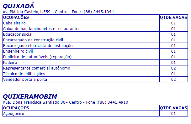 Confira abaixo somente as vagas para as cidades de Quixadá e Quixeramobim, divulgadas pelo Sine/IDT.
