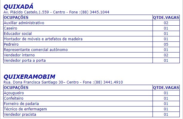 Para Quixadá e Quixeramobim as vagas disponíveis são para caseiro, educador social, confeiteiro, vendedor pracista, entre outros.