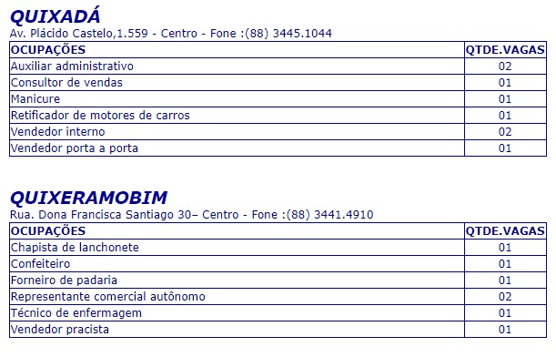Para Quixadá e Quixeramobim as vagas disponíveis são para manicure, vendedor interno, confeiteiro, técnico de enfermagem, entre outros.