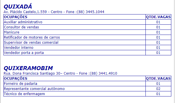 Os interessados em uma das vagas apresentadas na lista deverá se dirigir a unidade do Sine/IDT que em Quixadá fica localizada no Terminal Rodoviário, e em Quixeramobim na Rua Dona Francisca Santiaga, nº 30, Centro. Importante ressaltar que não serão repassadas por telefone, as pessoas devem se deslocar até um dos escritórios do Sine.