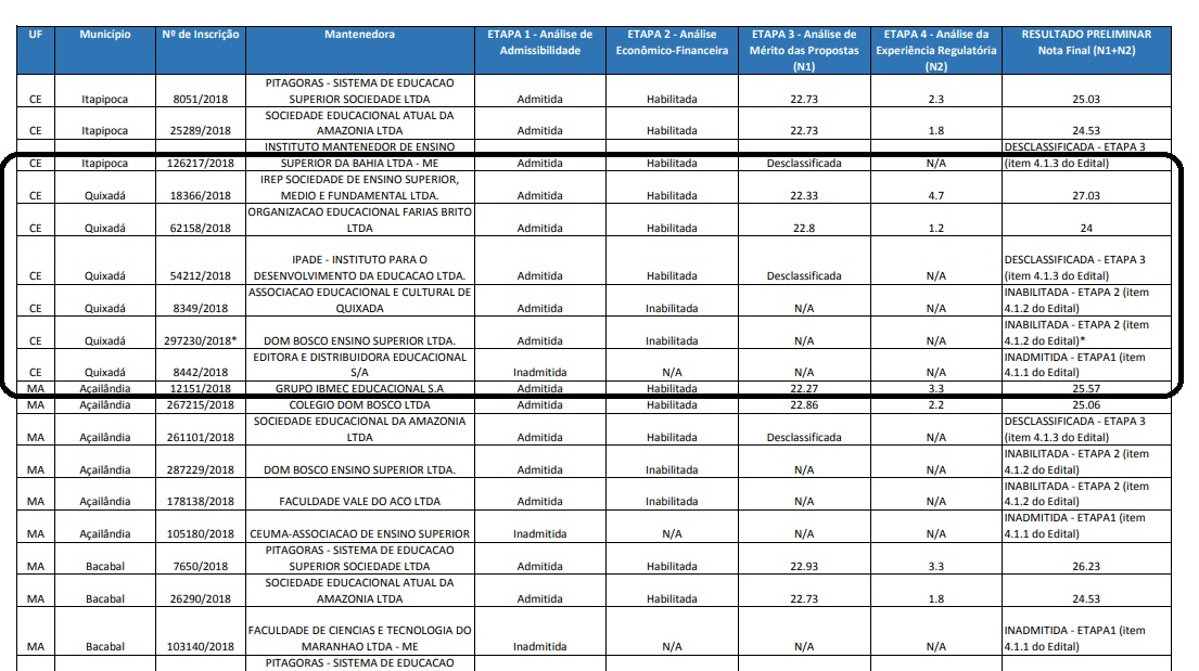 Dentre as concorrentes somente duas ficaram habilitadas em todas as etapas: a IREP – Sociedade de Ensino Superior, Médio e Fundamental Ltda. – que é a mantenedora da Estácio FIC e a Organização Educacional Farias Brito. Porém a que ficou com a melhor classificação e que deverá implantar a faculdade de medicina em Quixadá será a mantenedora da Estácio FIC.