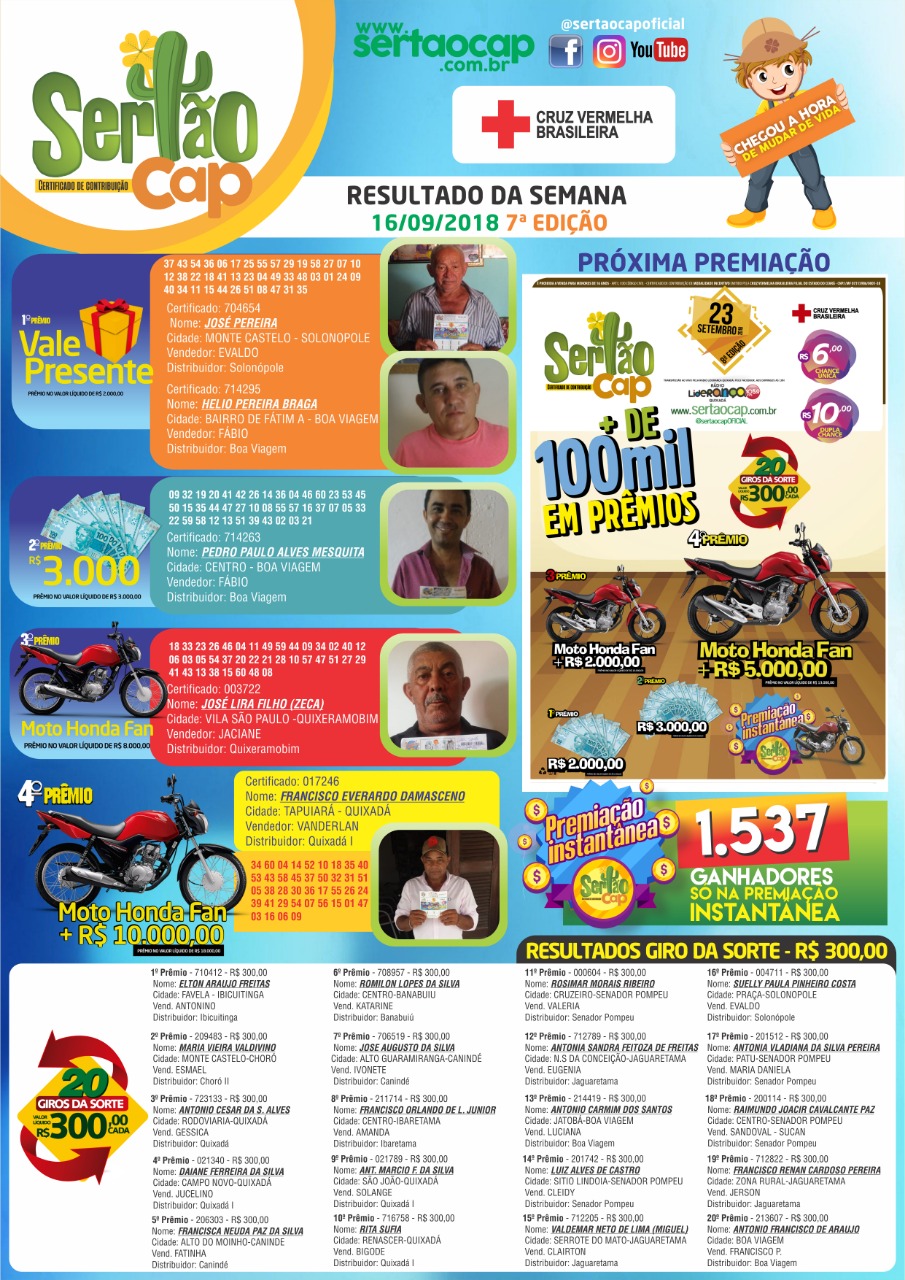 O Sertão Cap – Certificado de Contribuição da Cruz Vermelha Brasileira continua premiando centenas de pessoas em toda a região do Sertão Central. Na 7ª edição que aconteceu neste domingo (16) foram 1.537 ganhadores na premiação instantânea, além de outros 20 ganhadores no “Giro da Sorte” que ganharam R$ 300,00 cada, e mais cinco ganhadores do 1º ao 4º prêmio.