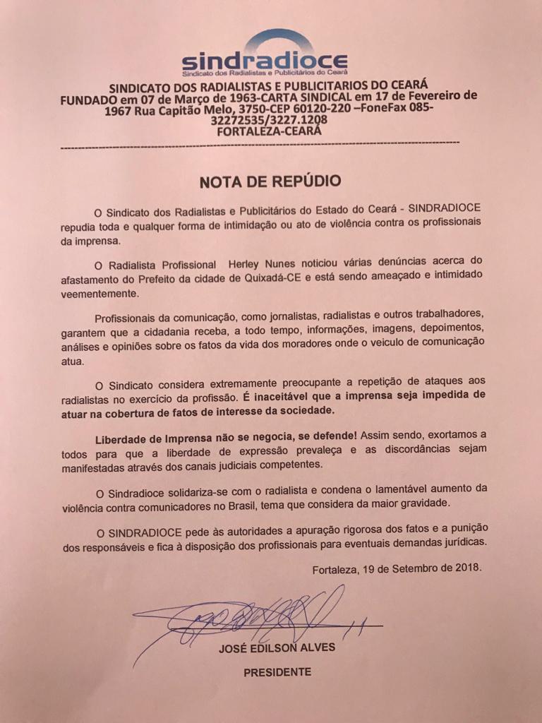 Nesta quarta-feira (19) o Sindicato dos Radialistas e Publicitários do Ceará divulgou uma nota de apoio ao radialista Herley Nunes. “É inaceitável que a imprensa seja impedida de atuar na cobertura de fatos de interesse da sociedade”, ressaltou José Edilson Alves, presidente do Sindradioce. Leia a nota na íntegra: