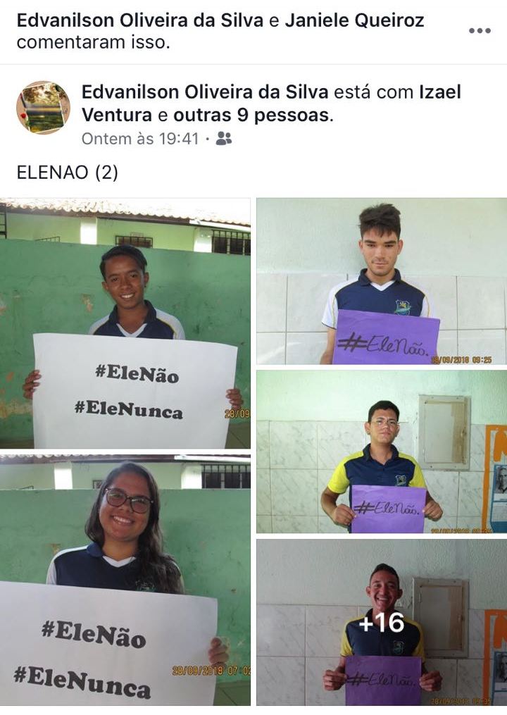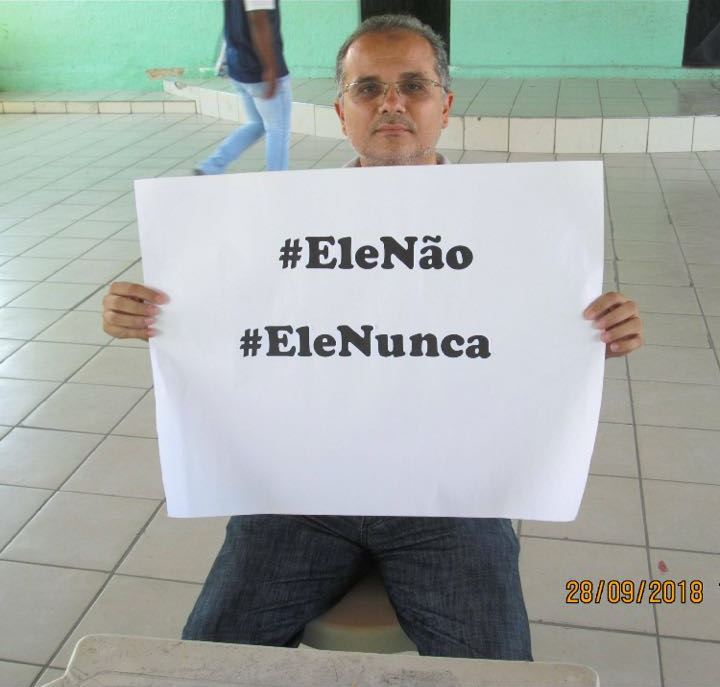 Nas imagens enviadas à redação do Monólitos Post, pelo menos quatro alunos e um professor seguram cartazes com as hashtags “Ele não” e “Ele nunca”. As frases ganharam força na Internet por eleitores que fazem campanha contra o presidenciável Jair Bolsonaro, que lidera as pesquisas na corrida ao Palácio do Planalto.