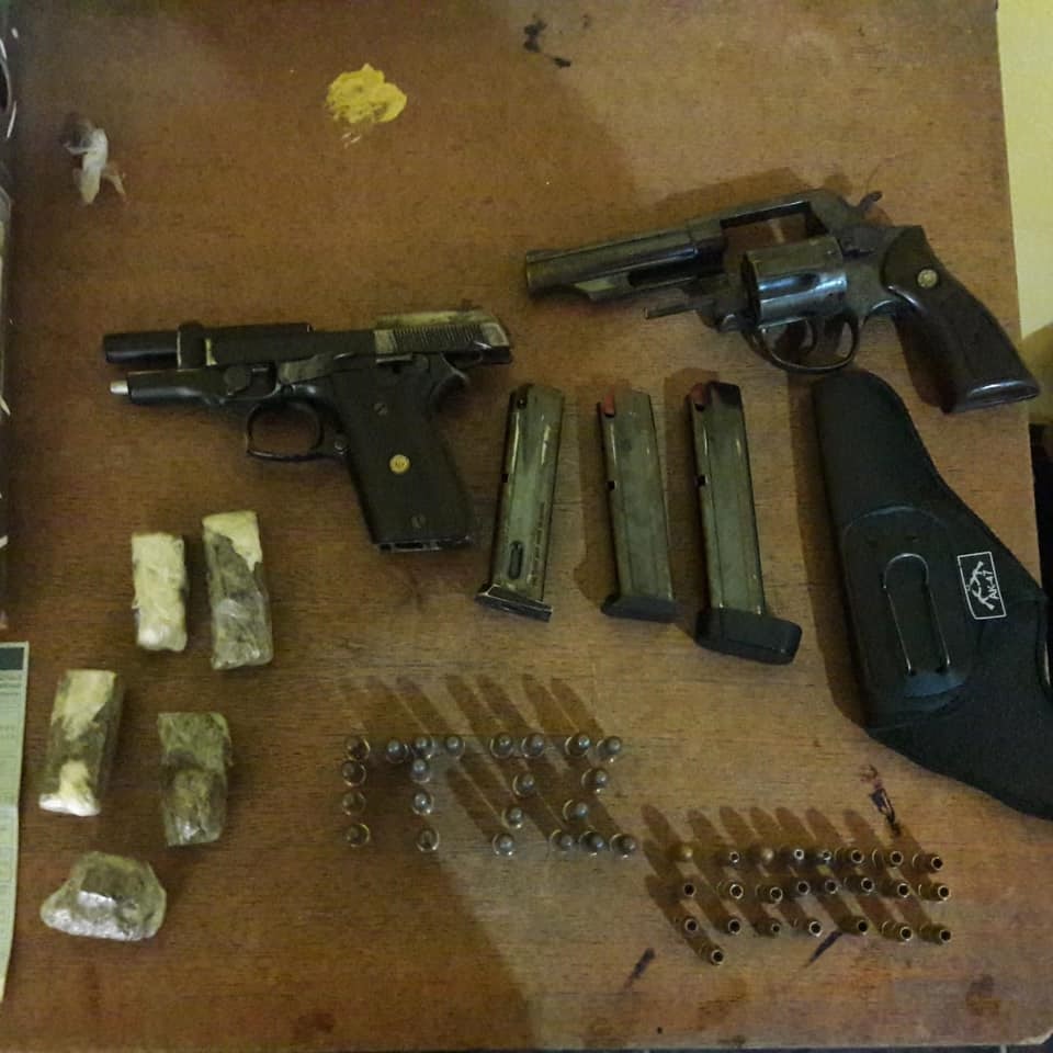 Prosseguindo as buscas, os PMs localizaram em um fundo falso no painel do carro 01 pistola calibre 380, com a numeração raspada, além de 03 carregadores contendo 24 munições do mesmo calibre e 05 pequenos tabletes de maconha prensada.