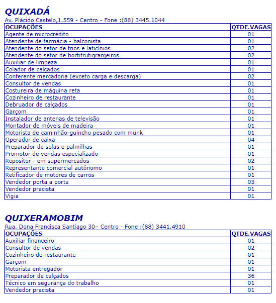 Para Quixadá e Quixeramobim as vagas disponíveis são para agente de microcrédito, garçom, vendedor pracista, entre outros.
