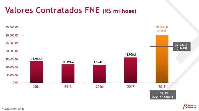O Banco do Nordeste fechou o mês de outubro com R$ 23,2 bilhões contratados com recursos do Fundo Constitucional de Financiamento do Nordeste (FNE). O resultado representa recorde histórico e crescimento de 90% em relação ao mesmo período de 2017, quando o Banco havia fechado R$ 12,2 bilhões em financiamentos no Nordeste, além do norte de Minas Gerais e do Espírito Santo.