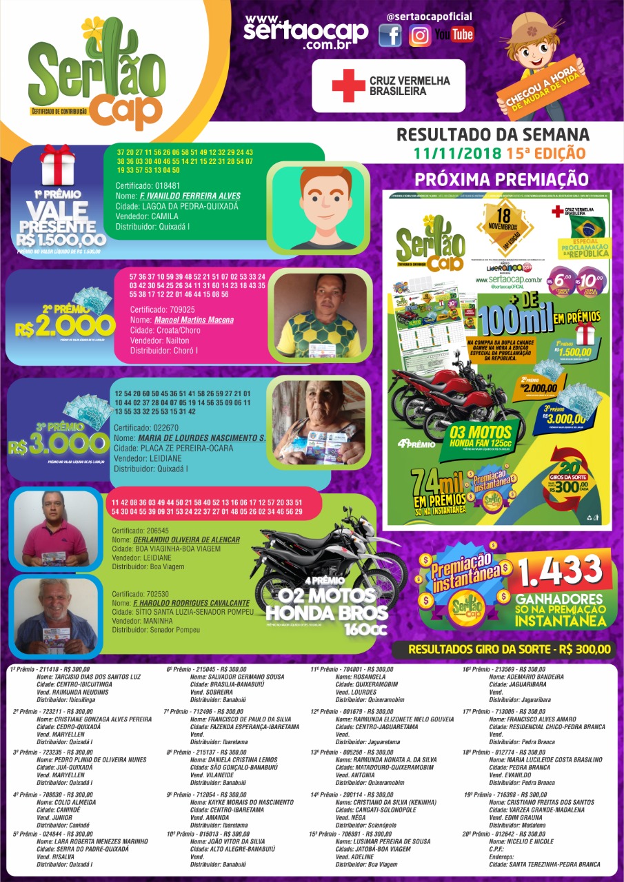 O Sertão Cap – Certificado de Contribuição da Cruz Vermelha Brasileira continua premiando centenas de pessoas em toda a região do Sertão Central. Na 15ª edição que aconteceu neste domingo (11) foram 1.433 ganhadores na premiação instantânea, além de outros 20 ganhadores no “Giro da Sorte” que ganharam R$ 300,00 cada, e mais cinco ganhadores do 1º ao 4º prêmio.
