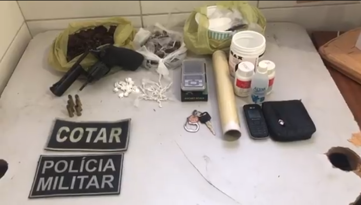 Um casal que estava na casa acabou preso. Durante revista na residência os PMs localizaram 83 trouxas de maconha (pesando 614g), 47 pedras de crack (pesando 4g), 17 trouxas de cocaína (pesando 5,6g), além de 01 revólver calibre 38, com 05 munições intactas e 01 deflagrada, 01 balança de precisão, aparelhos celulares e 01 motocicleta.