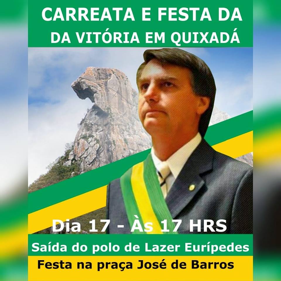 Neste sábado (17), os apoiadores de Jair Bolsonaro realizarão a carreata da vitória do novo presidente da república. Segundo os organizadores, a carreata terá início a partir das 17h com saída prevista para o pólo de lazer do Eurípedes e deverá percorrer as principais ruas e avenidas da cidade como uma forma de agradecimento aos mais de 13 mil votos recebidos por Bolsonaro em Quixadá no 2º turno das eleições 2018.