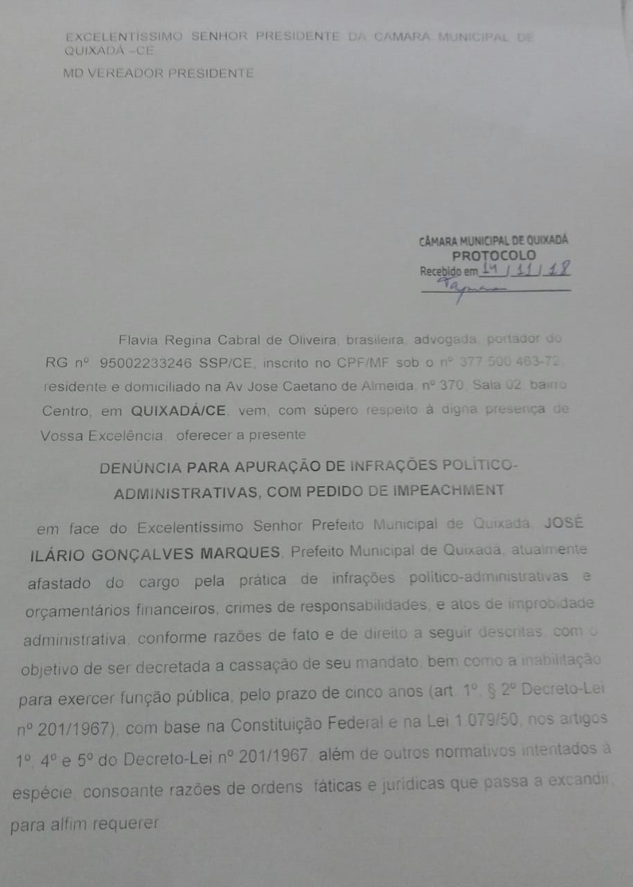 Uma denúncia para apuração de infrações político-administrativas, com pedido de impeachment foi realizada pela advogada Flávia Regina Cabral e protocolada na Câmara Municipal de Quixadá na última quarta-feira (14). A denunciante, assim como o petista, pode entrar para a história do município, pois por conta dela será a primeira vez que os vereadores se deparam com um pedido de cassação de mandato em virtude de suspeita de corrupção e fraude fiscal na Prefeitura.