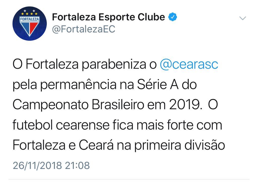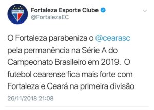 “O Fortaleza parabeniza o Ceará pela permanência na Série A do Campeonato Brasileiro 2019. O futebol cearense fica mais forte com Fortaleza e Ceará na primeira divisão”, escreveu o Twitter do Fortaleza.