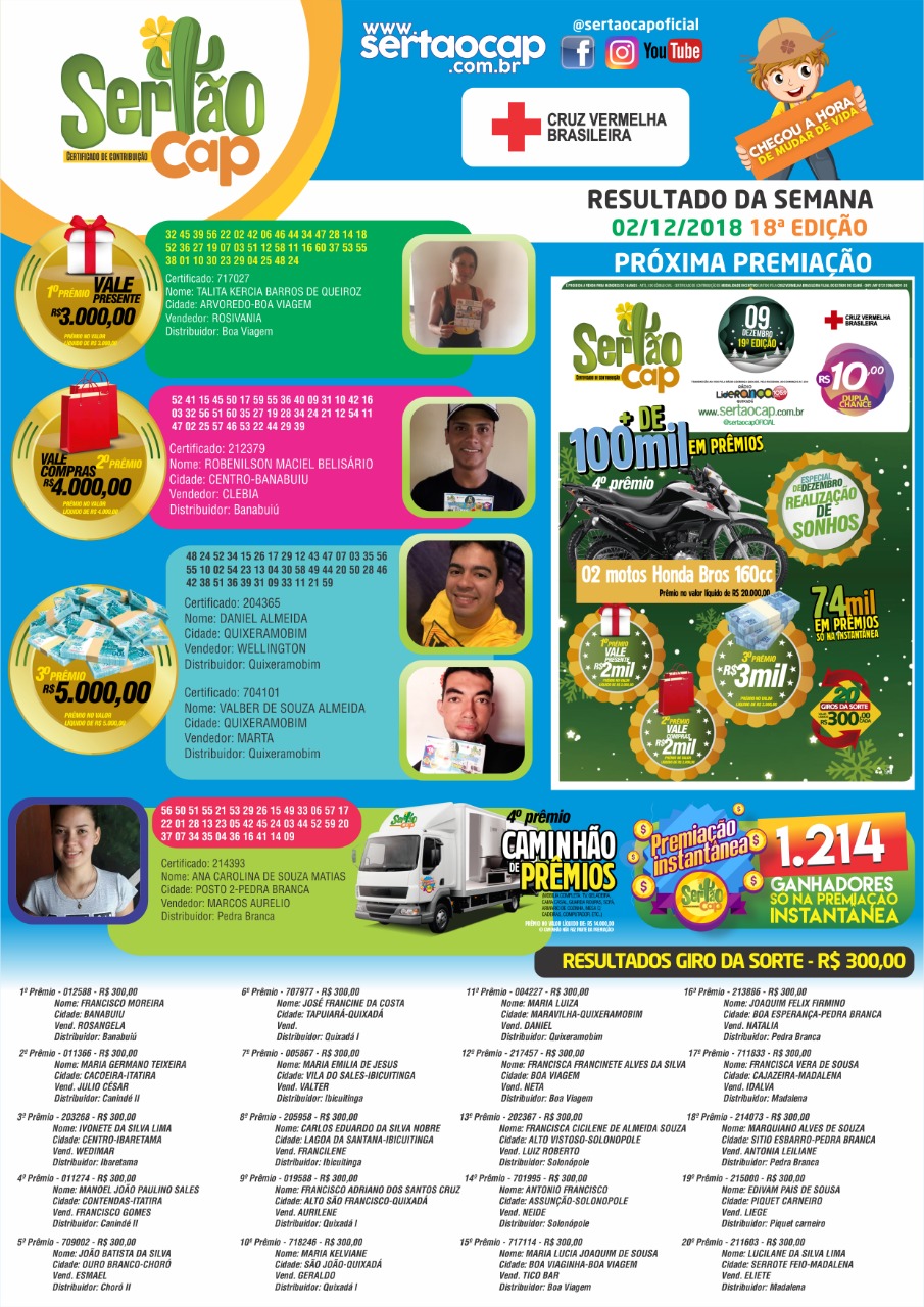 O Sertão Cap – Certificado de Contribuição da Cruz Vermelha Brasileira continua premiando centenas de pessoas em toda a região do Sertão Central. Na 18ª edição que aconteceu neste domingo (02) foram 1.214 ganhadores na premiação instantânea, além de outros 20 ganhadores no “Giro da Sorte” que ganharam R$ 300,00 cada, e mais cinco ganhadores do 1º ao 4º prêmio.