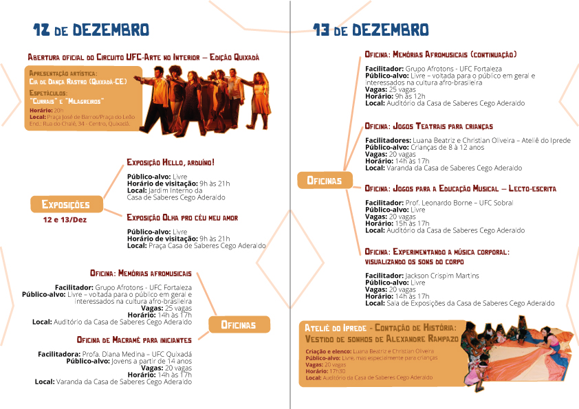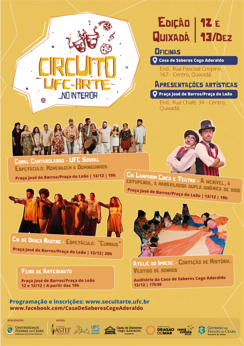 Nos dias 12 e 13 de dezembro, a Secretaria de Cultura Artística da Universidade Federal do Ceará promove a quarta edição do Circuito UFC-Arte no Interior no município de Quixadá. Esta edição é realizada em parceria com a Casa de Saberes Cego Aderaldo e o Campus da UFC Quixadá. Participam da programação projetos das áreas de Teatro, Música, Arte Circense, Cultura afrobrasileira e Design Digital.