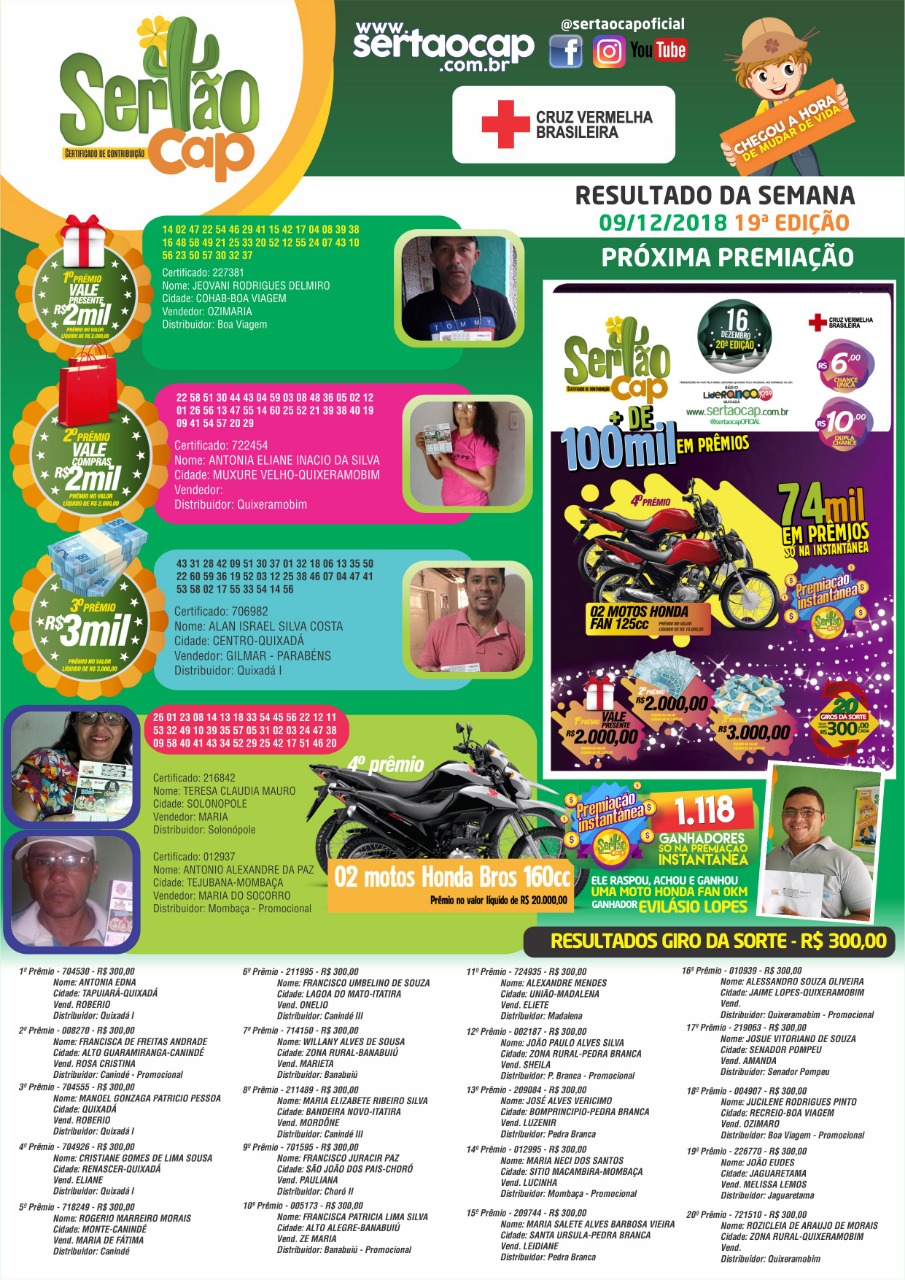 O Sertão Cap – Certificado de Contribuição da Cruz Vermelha Brasileira continua premiando centenas de pessoas em toda a região do Sertão Central. Na 19ª edição que aconteceu neste domingo (09) foram 1.118 ganhadores na premiação instantânea, entre eles o senhor Evilásio Lopes, que raspou e ganhou na hora 01 moto Honda Fan 0 Km, além de outros 20 ganhadores no “Giro da Sorte” que ganharam R$ 300,00 cada, e mais cinco ganhadores do 1º ao 4º prêmio.