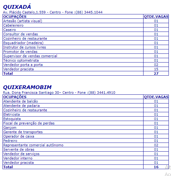 Para Quixadá e Quixeramobim as vagas disponíveis são para caseiro, cabeleireiro, garçom, pedreiro, entre outros.