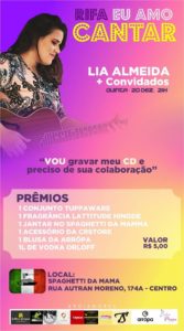 O sorteio deverá ser realizado na próxima quinta-feira (20), no Spaghetti da Mamma, onde a cantora estará se apresentando juntamente com convidados a partir das 21h e quem adquirir o ponto da rifa que custa apenas R$ 5,00 estará concorrendo a 01 conjunto Tuppaware, 01 fragrância Lattitude Hinode, 01 jantar no Spaghetti da Mamma, 01 acessório da Crstore, 01 blusa da Arrôpa e 01 litro de vodka Orloff.
