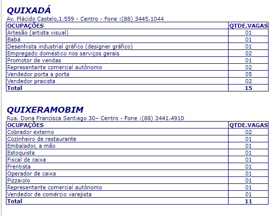 Para Quixadá e Quixeramobim as vagas disponíveis são para babá, vendedor porta a porta, estoquista, frentista, entre outros.