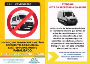 Já nesta terça-feira (08) foi a vez da prefeitura de Ibaretama suspender o transporte de pacientes para consultas eletivas na capital cearense. Em nota, a gestão municipal também alegou a falta de segurança e a onda de ataques criminosos para suspender o serviço. No entanto, os transportes de urgência, emergência e para hemodiálise continuam garantidos.