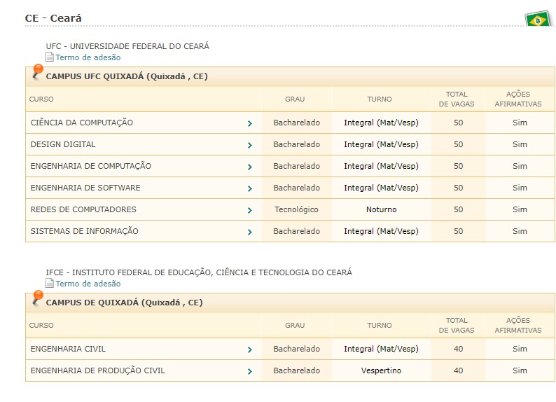 Em Quixadá estão sendo ofertadas 380 vagas no IFCE e UFC para os cursos de Ciência da Computação, Design Digital, Engenharia de Computação, Engenharia de Software, Redes de Computadores, Sistemas de Informação, Engenharia Civil, Engenharia de Produção Civil. Veja abaixo a quantidade de vagas ofertadas por curso exclusivamente em Quixadá.