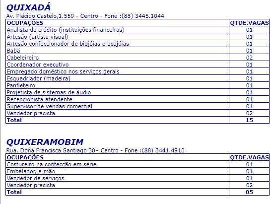 Confira abaixo somente as vagas para as cidades de Quixadá e Quixeramobim, divulgadas pelo Sine/IDT.