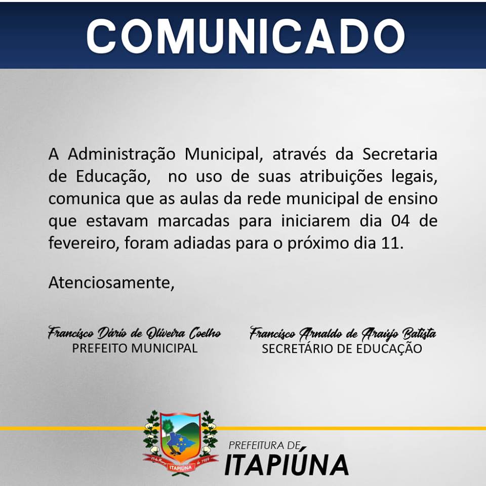 Em contato com a secretaria de Educação de Itapiúna, a gestão afirmou que o adiamento se deu devido a reforma em algumas escolas quw ainda ss encontram em andamento, bem como alguns materiais escolares que ainda não chegaram e os ônibus escolares que se encontram em manutenção.