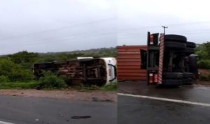 Uma colisão envolvendo uma carreta que transportava um container carregado de sal e um micro-ônibus escolar deixou uma estudante ferida na manhã desta quinta-feira (07) no município de Ocara.