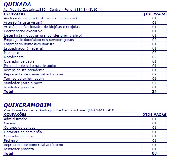 Confira abaixo somente as vagas para as cidades de Quixadá e Quixeramobim, divulgadas pelo Sine/IDT.