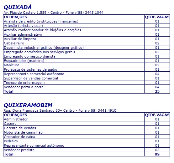 Confira abaixo somente as vagas para as cidades de Quixadá e Quixeramobim, divulgadas pelo Sine/IDT.