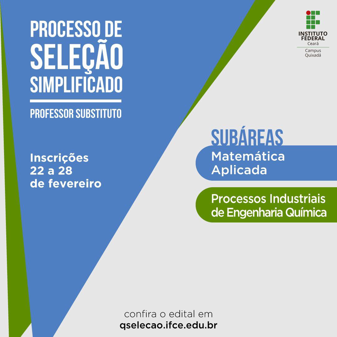 Está publicado no q-seleção o edital para o Processo Seletivo Simplificado (PSS) 03/2019, para contratação de dois professores substitutos, as vagas são para as subáreas de: Processos Industriais de Engenharia Química e Matemática Aplicada.