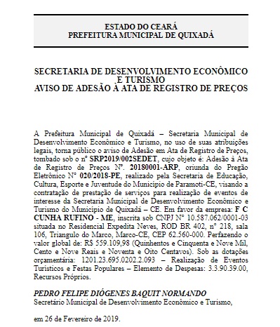 Sem informar ao certo, em que foram, ou serão, gastos R$ 559.109,98 (Quinhentos e cinquenta e nove mil, cento e nove reais e noventa e oito centavos), a gestão municipal se limitou a comunicar, em um Aviso de adesão à ata registro de preços, que o valor será utilizado na realização de eventos turísticos e festas populares.