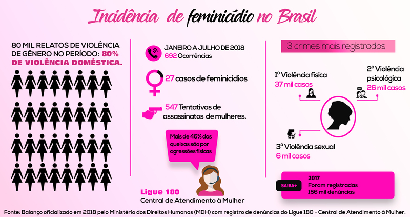 De janeiro a julho, o Ligue 180 – o Centro Especializado de Atendimento à Mulher (Ceam) –  registrou mais de 740 ocorrências no Brasil relacionadas à feminicídio. O balanço do Ministério dos Direitos Humanos (MDH) mostra que foram registrados 27 casos de feminicídio e 547 tentativas de assassinatos de mulheres, só nos seis primeiros meses do ano passado.