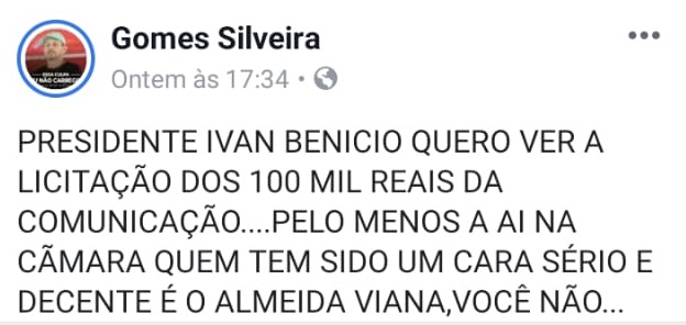 Em relação a fraude em licitação, Gomes Silveira questiona o processo responsável pela Comunicação do Legislativo local. “Presidente Ivan Benício quero ver a licitação dos 100 mil reais da Comunicação…”, comentou.