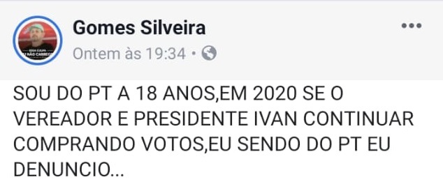 Durante as últimas horas, várias foram as denúncias e postagens do radialista contra Ivan Construções. Em uma delas, ele relata que está no PT há 18 anos e que denunciará o presidente da Câmara de Quixadá por compra de voto. “Sou do PT a 18 anos, em 2020 se o vereador e presidente Ivan continuar comprando votos, eu sendo do PT eu denuncio…”, ameaçou.