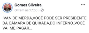 O ex-radialista Gomes Silveira, conhecido nas redes sociais por chantagear políticos do município de Quixadá, voltou a atacar novamente. Desta vez, ele, que é assessor do gabinete do prefeito Ilário Marques (PT), mirou em um correligionário, o presidente da Câmara Municipal, Ivan Construções.