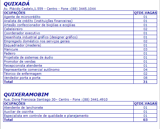 Confira abaixo somente as vagas para as cidades de Quixadá e Quixeramobim, divulgadas pelo Sine/IDT.