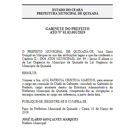 Retomaram seus cargos, a chefe de gabinete, Patrícia Martins e o controlador do município, Humberto Torres. Para quem não lembra, Patrícia esta na mira do Ministério Publico mesmo antes da atual gestão assumir. Ela, juntamente com o esposo, logo após as eleições de 2016, realizou boletim de ocorrência contra o concurso público realizado pela administração João da Sapataria e que foi anulado por Ilário Marques tão logo assumiu a chefia do Executivo local, ou seja, foi acusada de realizar uma trama para dar uma falsa impressão de que a anulação do concurso era legal. Em 2018, justiça validou o concurso, o que confirmou que Patrícia está no cargo para garantir os interesses do prefeito de Quixadá.