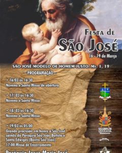 A programação em homenagem a São José já vem acontecendo desde o último sábado (16) com novenas e missas sempre a partir das 16h:30min. Já nesta terça-feira (19), a programação terá início a partir das 5h da manhã, com a saída da procissão de São José da Paróquia de São João Batista e Santa Edwiges, no bairro São João, de onde os fiéis seguirão até a Paróquia de Jesus Maria e José (Catedral de Quixadá), onde será celebrada a santa missa que deverá ser presidida pelo Bispo Diocesano, Dom Angelo Pignoli.