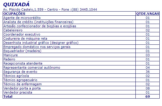 Confira abaixo somente as vagas para a cidade de Quixadá, divulgadas pelo Sine/IDT.